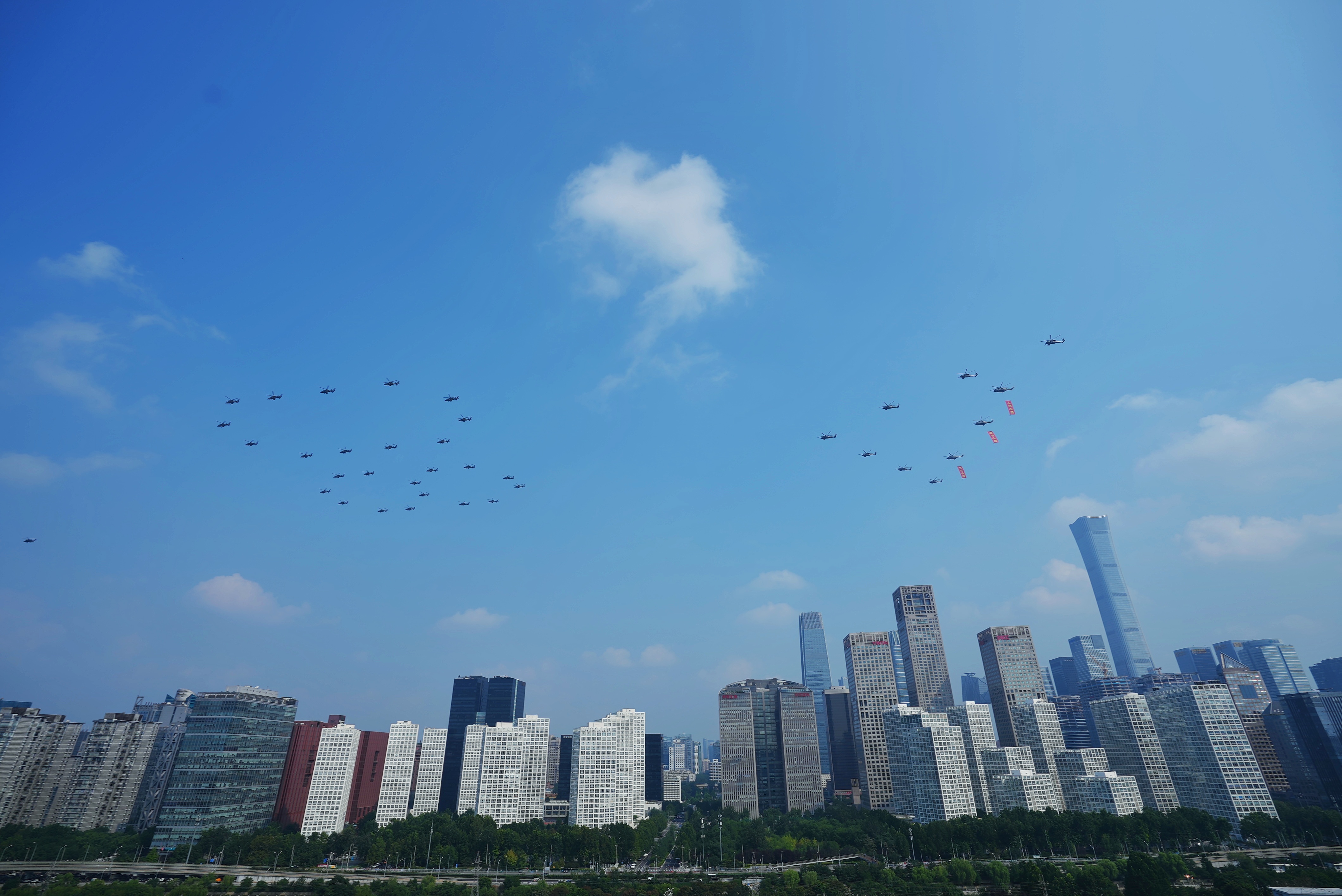 9月3日上午,空中护旗梯队飞过天安门广场上空,拉开了阅兵分列式帷幕。摄影:廖灿培