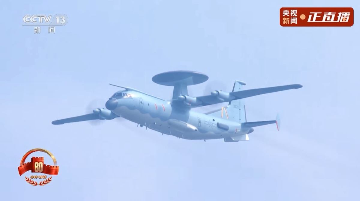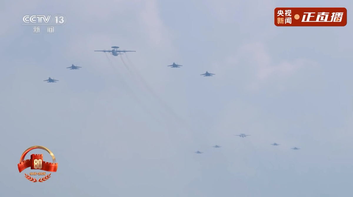 空中梯队开始接受检阅。预警指挥机梯队首先飞过天安门广场上空。空警500A与歼16战机编队,空警600与歼15T舰载机编队,依次接受检阅。