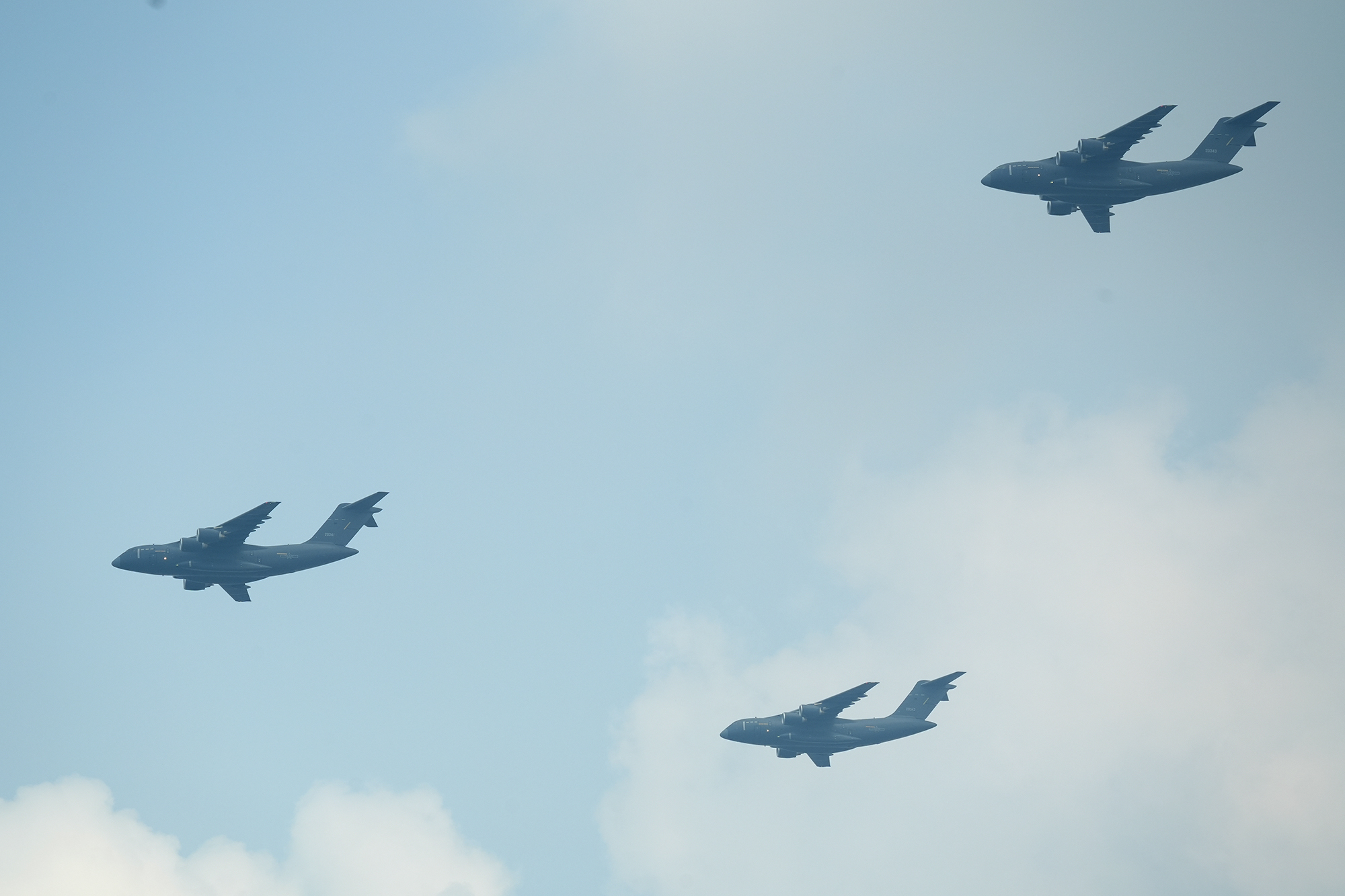 运20A、运20B编成两个楔队,以战斗姿态编组飞行。新型多用途运输机配装新型国产发动机,航程远、载重大、速度快,具备远程战略投送能力。摄影:郑宇航