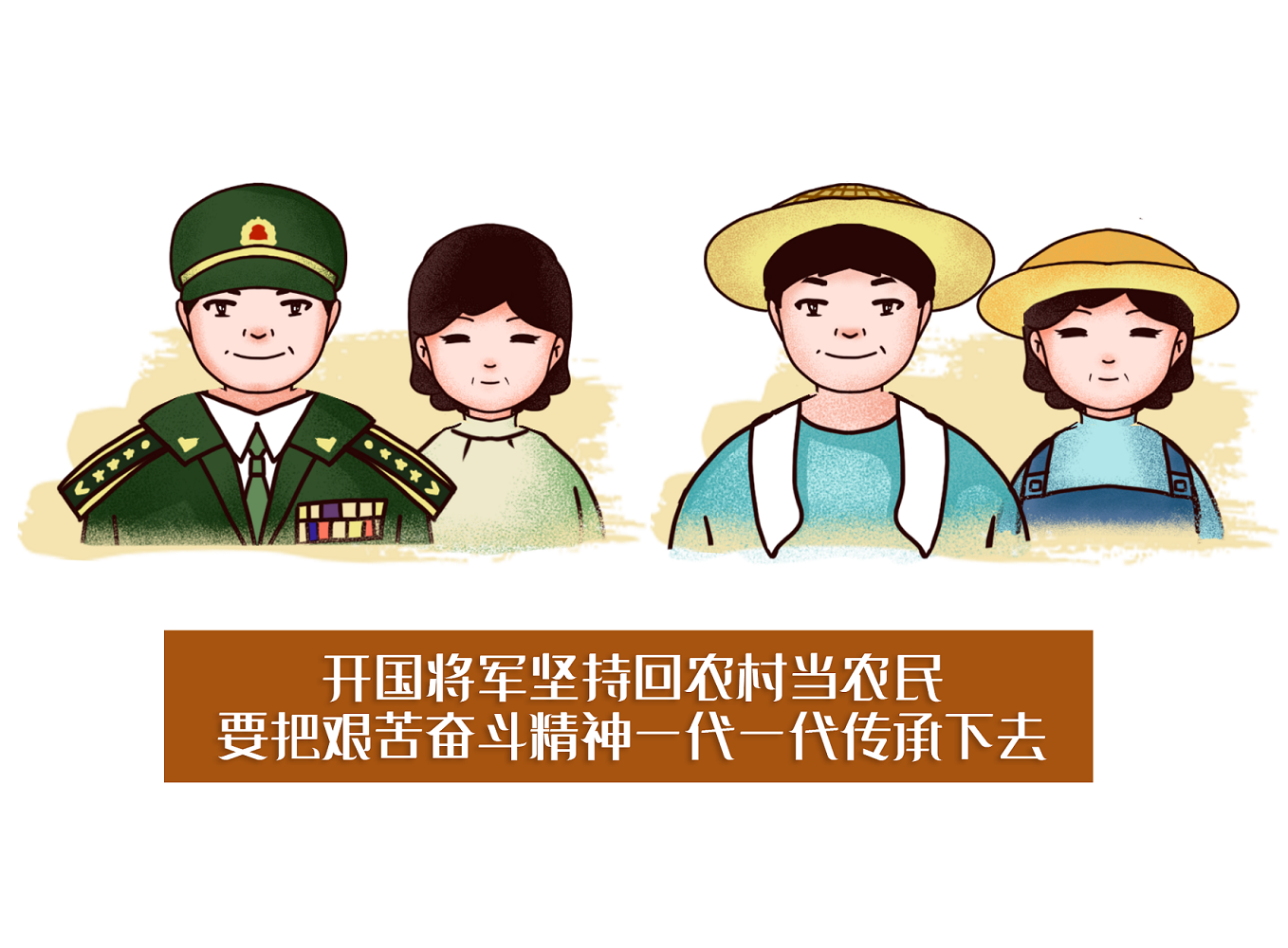 1957年8月,在被授予少将军衔后不到两年,甘祖昌主动向组织上辞去新疆军区后勤部长职务,带着妻子龚全珍,回家乡江西省莲花县坊楼乡沿背村务农。甘祖昌将每月工资几乎全捐献出来,用于修电站、建学校、救济贫困户。